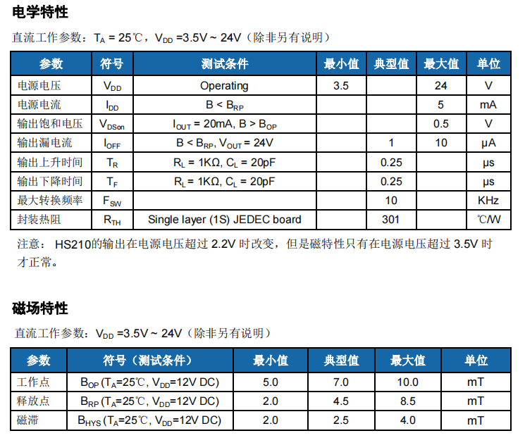 HS210是一款基于混合信號CMOS技術的單極鎖存型霍爾效應傳感器,器件內部集成了電壓調節器、帶動態偏置補償系統的霍爾傳感器、施密特觸發器和一個開漏極輸出驅動,這些都在一個封裝里。