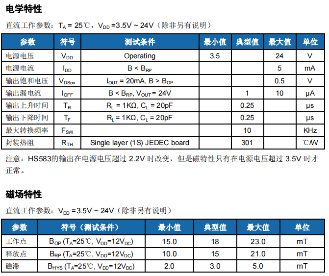 HS583是一款基于混合信號CMOS技術的單極鎖存型霍爾效應傳感器,器件內(nèi)部集成了電壓調(diào)節(jié)器、帶動態(tài)偏置補償系統(tǒng)的霍爾傳感器、施密特觸發(fā)器和一個開漏極輸出驅(qū)動,這些都在一個封裝里。