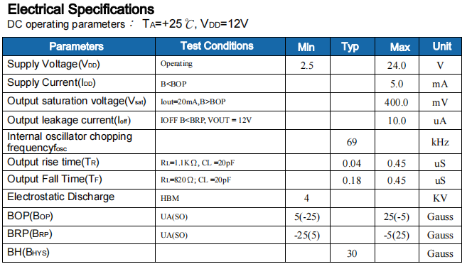 The HS188 contains the following on a single chip: voltage regulator, Hall voltage generator, small signal amplifier, chopper stabilizer, Schmitt trigger, Advanced DMOS wafer fabrication processes are used to take advantage of low voltage requirements, component matching, very low input offset errors, and small component geometries.