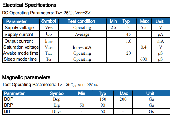 4. Operating voltage as low as 1.65V, unipolar micro-power Hall switch