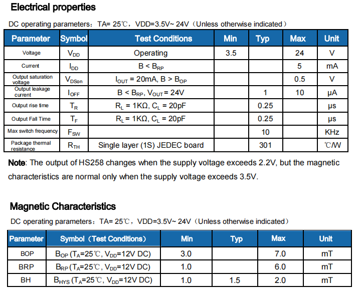 HS258 is a unipolar Hall effect switch IC, manufactured using advanced BiCMOS process, with excellent temperature stability and high mechanical stress resistance, the product's maximum operating temperature can reach 150°C.
