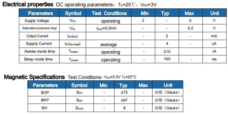 In terms of circuit design, HS260 provides an embedded controlled clock mechanism to provide a clock source for the Hall device and analog signal processing circuit. At the same time, this controlled clock mechanism can send a control signal to make the circuit with highcurrent consumption enter the "sleep" mode periodically; through this mechanism, the chip is periodically "woken up" and detects the strength of the magnetic field passing through the Hall device according to the predetermined magnetic field strength threshold. If the magnetic flux density is higher than the "operating point" threshold or lower than the "release point" threshold, the open-drain output transistor is driven and latched into the corresponding state. In the "sleep" cycle, the output transistor is locked in its previous state. In battery-powered applications, this design provides the best support for extending the working life.