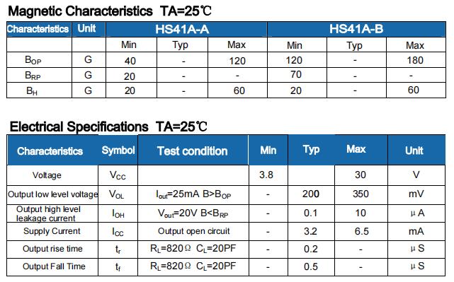 HS41A unipolar switch type Hall position sensor is a magnetic sensing circuit composed of an internal voltage regulator, a Hall voltage generator, a differential amplifier, a temperature compensation unit, a Schmitt trigger and an open collector output stage. Its input is magnetic induction intensity and its output is a digital voltage signal. It is a single-pole magnetic sensing circuit suitable for working under rectangular or cylindrical magnets. The operating temperature range is -40 ℃ ~ 150 ℃, the power supply voltage operating range is 3.8V ~ 30V, the load current capacity can reach up to 50mA, and the package form is SIP3L (TO92S).