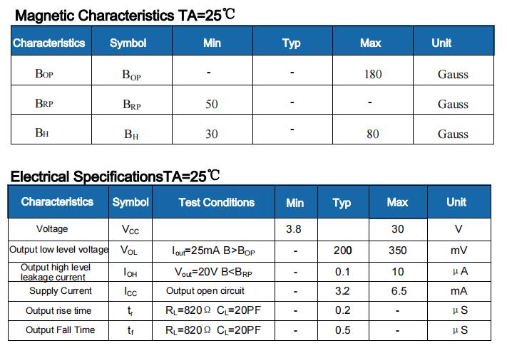 HS43A unipolar switch type Hall position sensor is a magnetic sensing circuit composed of an internal voltage regulator, a Hall voltage generator, a differential amplifier, a temperature compensation unit, a Schmitt trigger and an open collector output stage. Its input is magnetic induction intensity and its output is a digital voltage signal. It is a single-pole magnetic sensing circuit suitable for working under rectangular or cylindrical magnets. The operating temperature range is -40 ℃ ~ 150 ℃, the power supply voltage operating range is 3.8V ~ 30V, the load current capacity can reach up to 50mA, and the package form is SIP3L (TO92S).