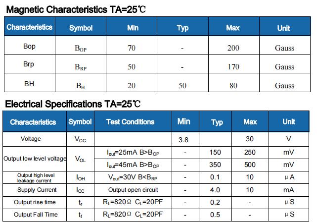 HS43F unipolar switch type Hall position sensor is a magnetic sensing circuit composed of an internal voltage regulator, a Hall voltage generator, a differential amplifier, a temperature compensation unit, a Schmitt trigger and an open collector output stage. Its input is magnetic induction intensity and its output is a digital voltage signal. It is a single-pole magnetic sensing circuit suitable for working under rectangular or cylindrical magnets. The operating temperature range is -40 ℃ ~ 150 ℃, the power supply voltage operating range is 3.8V ~ 30V, the load current capacity can reach up to 50mA, and the package form is SIP3L (TO92S).