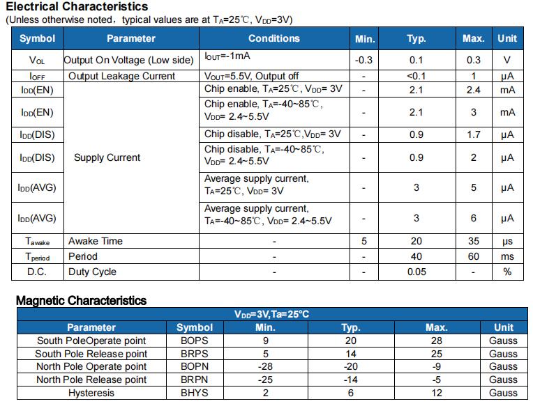 In terms of circuit design, HS479 provides an embedded controlled clock mechanism to provide clock source for Hall devices and analog signal processing circuits. At the same time, this controlled clock mechanism can send control signals to make the circuits with large current consumption periodically enter "sleep" mode; through this mechanism, the chip is periodically "woken up" and detects the strength of the magnetic field passing through the Hall device according to the predetermined magnetic field strength threshold. If the magnetic flux density is higher than the "operating point" threshold or lower than the "release point" threshold, the open-drain output transistor is driven and latched into the corresponding state. During the "sleep" cycle, the output transistor is locked in the previous state. In battery-powered applications, this design provides the best support for extending the working life.