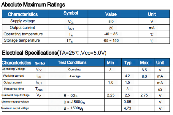 When the S pole appears on the HS49E marking surface, the output voltage will increase linearly with the increase of magnetic field strength; conversely, the N pole will cause the output voltage to decrease linearly with the increase of magnetic field strength.