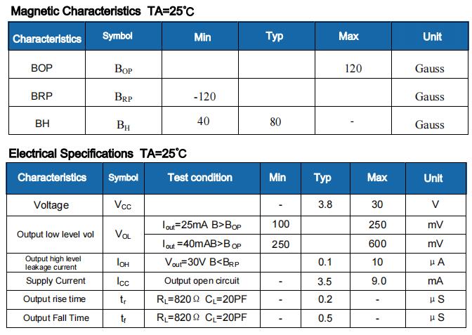 Recommended model: HS41F/HS261 bipolar high-sensitivity brushless motor Hall switchThe HS41F high-temperature bipolar latch Hall effect position sensor is a magnetic sensing circuit composed of an internal voltage regulator unit, a Hall voltage generator, a differential amplifier, a temperature compensation unit, a Schmitt trigger and an open collector output stage. Its input is magnetic induction intensity and its output is a digital voltage signal.
