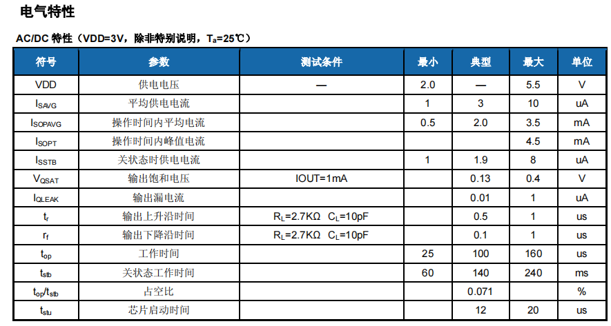 HS4915在電路設(shè)計(jì)上, 提供了一個(gè)內(nèi)嵌的受控時(shí)鐘機(jī)制來(lái)為霍爾器件和模擬信號(hào)處理電路提供時(shí)鐘源,同時(shí)這個(gè)受控時(shí)鐘機(jī)制可以發(fā)出控制信號(hào)使得消耗電流較大的電路周期性的進(jìn)入“休眠”模式;同樣通過(guò)這個(gè)機(jī)制,芯片被周期性的“喚醒”并且根據(jù)預(yù)定好的磁場(chǎng)強(qiáng)度閾值檢測(cè)外界穿過(guò)霍爾器件磁場(chǎng)強(qiáng)度的大小。如果磁通密度高于“操作點(diǎn)”閾值或者低于“釋放點(diǎn)”閾值,則開(kāi)漏輸出晶體管被驅(qū)動(dòng)并鎖存成與之相對(duì)應(yīng)的狀態(tài)。而在“休眠”周期中,輸出晶體管被鎖定在其先前的狀態(tài)下。在電池供電應(yīng)用中,這種設(shè)計(jì)對(duì)于延長(zhǎng)工作壽命提供了最好支持。
