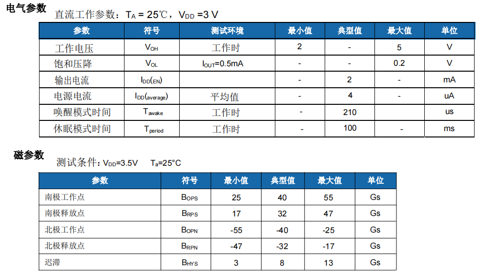 在電路設計上,HS621提供了一個內(nèi)嵌的受控時鐘機制來為霍爾器件和模擬信號處理電路提供時鐘源,同時這個受控時鐘機制可以發(fā)出控制信號使得消耗電流較大的電路周期性的進入“休眠”模式; 同樣通過這個 機制,芯片被周期性地“喚醒”并且根據(jù)預定好的磁場強度閾值檢測外界穿過霍爾器件磁場強度的大小。如果磁通密度高于“工作點”閾值或者低于“釋放點”閾值,則 開漏輸出晶體管被驅(qū)動并鎖存成與之相對應的狀態(tài)。而在“休眠”周期中,輸出晶體管被鎖定在其先前的狀態(tài)下。在電池供電應用中,這種設計對于延長工作壽命提供了最好的支持。