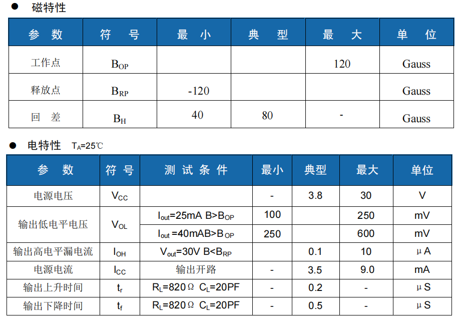 HS41F高溫雙極鎖存型霍爾效應(yīng)位置傳感器是由內(nèi)部電壓穩(wěn)壓?jiǎn)卧⒒魻栯妷喊l(fā)生器、差分放大器、溫度補(bǔ)償單元、施密特觸發(fā)器和集電極開(kāi)路輸出級(jí)組成的磁敏傳感電路,其輸入為磁感應(yīng)強(qiáng)度,輸出是一個(gè)數(shù)字電壓信號(hào)。