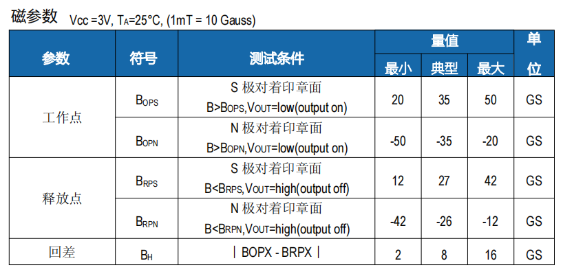 HS4913的輸出晶體管在面向封裝標示一面存在一定強南極或北極磁場時被鎖定在開狀態,而在無磁場時鎖定在關狀態。